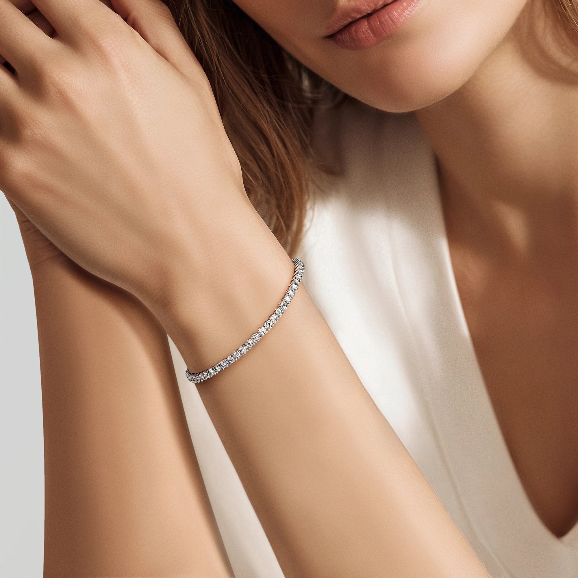 Hand-finished with precision and grace, the Signature Tennis Bracelet is a timeless symbol of elegance and grace. Featuring a continuous line of hand-cut 3 mm (total ≈5.5 ct diamond equivalent)A5 cubic zirconia, each stone sparkles with diamond-like brilliance, capturing the light from every angle.