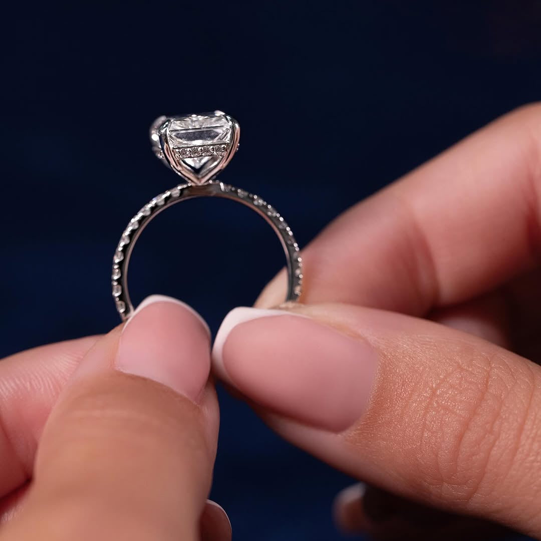 - Accents: Hand-set moissanite along the band and hidden halo, adding refined sparkle and enhancing the brilliance of the center stone.
