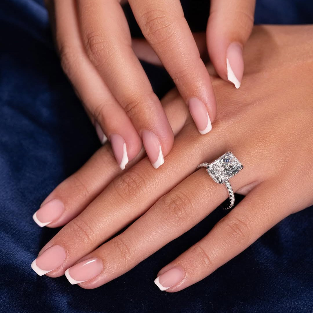 Hand-finished to shine through every chapter of your life, this radiant cut moissanite ring features a 10×8 mm center stone (≈3.5 ct diamond equivalent), framed by hand-set moissanite accents along the band and hidden halo.
