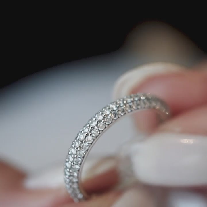 Crafted in rhodium-plated 925 sterling silver for lasting radiance and durability, this pavé band balances understated elegance with timeless versatility. Whether paired with a solitaire, layered in a modern stack, or worn solo, it adds refined sparkle to any look.
