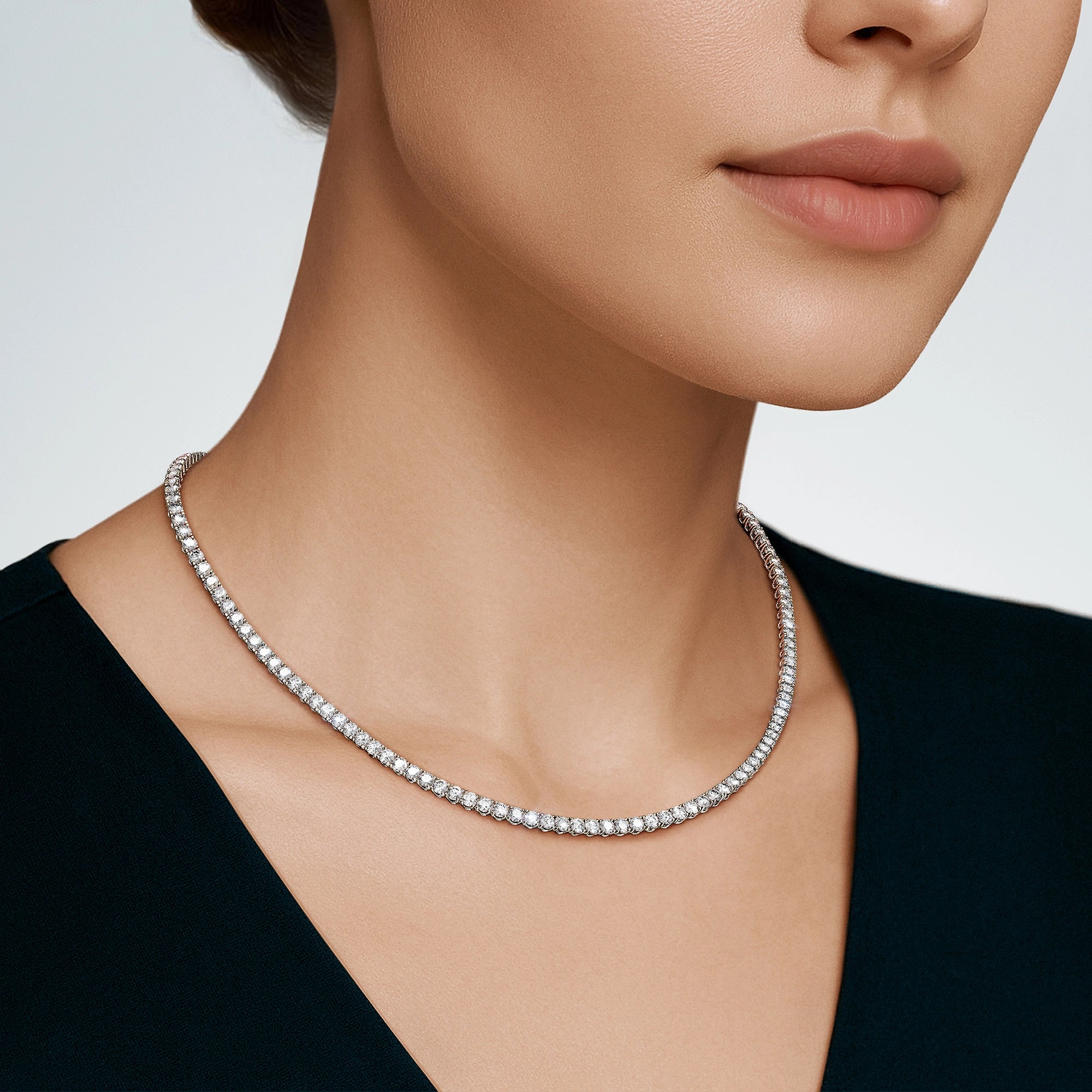 Hand-finished with precision and grace, the Signature Tennis Necklace is a timeless statement of elegance. Featuring a continuous line of 3 mm (≈15–18 ct total diamond equivalent depending on length) hand-cut A5 cubic zirconia, each stone sparkles with diamond-like brilliance, creating a refined silhouette that radiates sophistication.