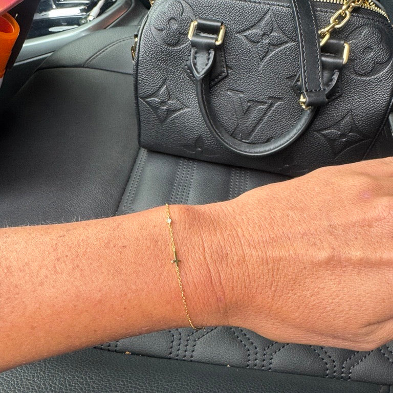 - Dainty chain necklace featuring a minimalist cross motif with a single sparkling moissanite accent, created as a timeless symbol of faith and everyday elegance