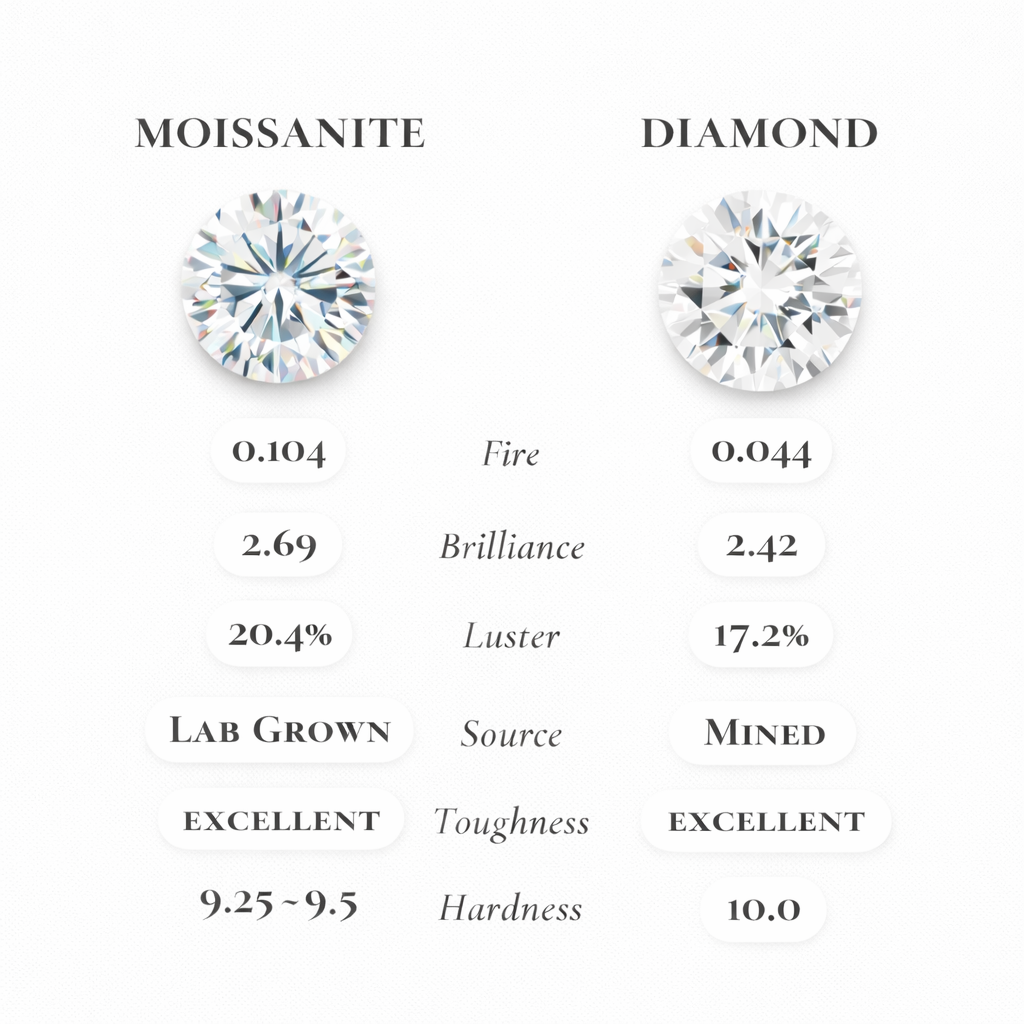Full band set with hand-cut, colorless moissanite gemstones, precision-cut for maximum brilliance. Each stone is near-flawless clarity, offering diamond-like sparkle with exceptional durability.